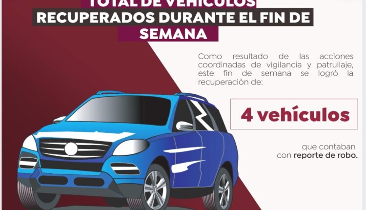 Playas de Rosarito, Baja California, 14 de julio de 2025. — Gracias a las labores de vigilancia, patrullaje y atención inmediata realizadas por elementos de la Secretaría de Seguridad Ciudadana, durante este fin de semana se logró la recuperación de cuatro vehículos con reporte de robo, fortaleciendo las acciones de prevención del delito que impulsa el Gobierno Municipal de Playas de Rosarito.