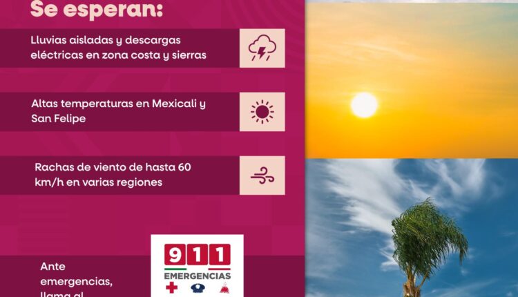 Por otro lado, en Mexicali y San Felipe se mantendrá cielo despejado, ambiente soleado y temperaturas elevadas, alcanzando máximas de hasta 39 °C en Mexicali y 34 °C en San Felipe. En estas regiones se recomienda a la población protegerse del calor, mantenerse hidratada, evitar la exposición prolongada al sol entre las 11:00 a.m. y 4:00 p.m., usar ropa ligera y no dejar a personas o mascotas dentro de vehículos cerrados.