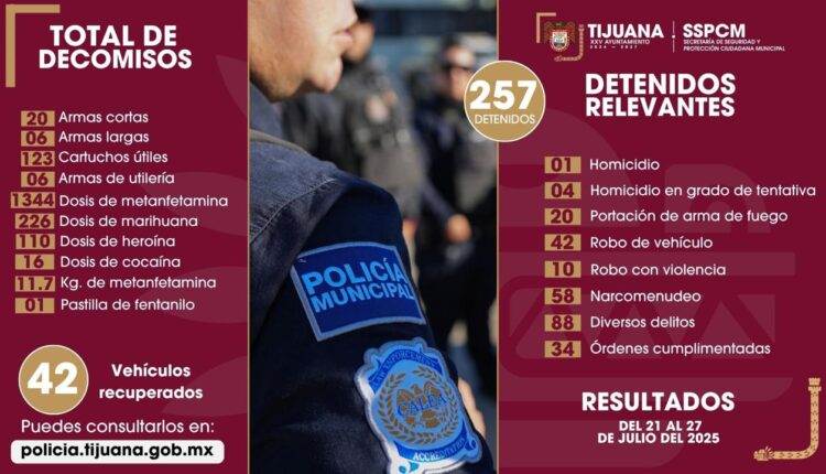 Tijuana, Baja California a 28 de julio de 2025. La Secretaría de Seguridad y Protección Ciudadana Municipal (SSPCM) informa que, mediante estrategias preventivas y de reacción inmediata, obtuvo resultados significativos en distintos ámbitos durante la semana del 21 al 27 de julio de 2025, contribuyendo a la recuperación de la paz y la tranquilidad en la ciudad.