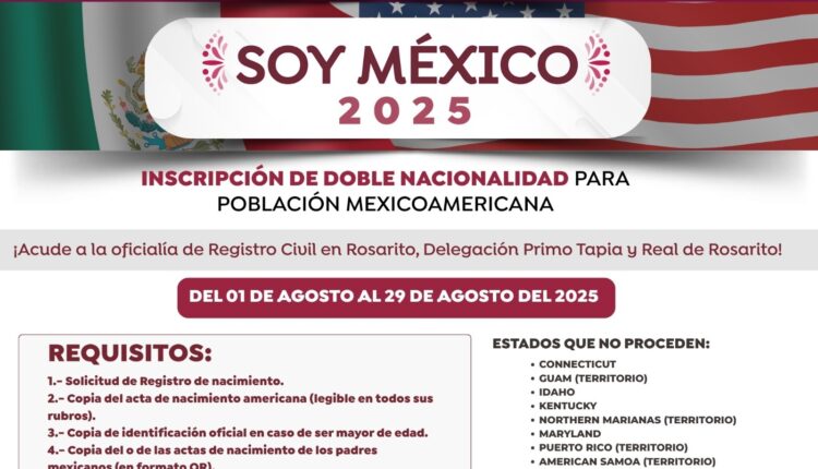 La campaña estará vigente desde el viernes 01 al martes 29 de agosto, y permitirá que menores de edad y estudiantes mayores de edad puedan tramitar de forma gratuita y simplificada su doble nacionalidad en las oficinas del Registro Civil del Ayuntamiento, así como en las delegaciones de Primo Tapia y Real de Rosarito.