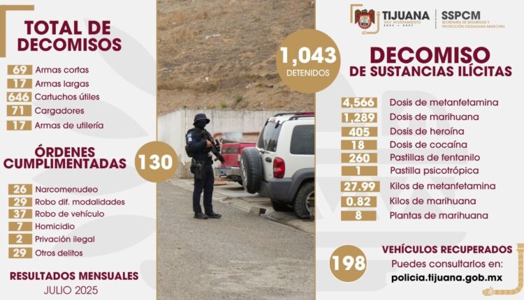 Tijuana, Baja California, a 1 de agosto de 2025.- La Secretaría de Seguridad y Protección Ciudadana Municipal (SSPCM), ha llevado a cabo un notable esfuerzo en la lucha contra la delincuencia durante el mes de julio, logrando el aseguramiento de 86 armas de fuego y la detención de mil 43 personas presuntamente involucradas en diversos delitos, lo que refleja una efectiva estrategia de prevención y trabajo de inteligencia operativa.