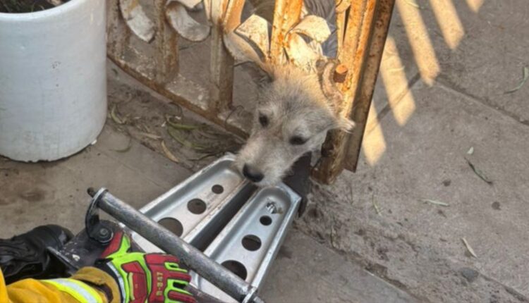 Playas de Rosarito, B.C. — Elementos del Cuerpo de Bomberos de Playas de Rosarito realizaron un rescate poco común la mañana de este domingo, al liberar a un perro cuya cabeza quedó atrapada entre los barrotes de una reja metálica, en la colonia Plan Libertador.