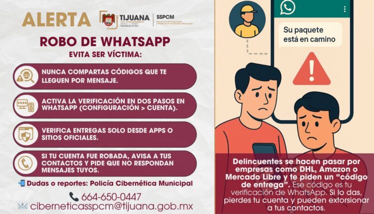 Tijuana, Baja California, a 5 de agosto de 2025. La Secretaría de Seguridad y Protección Ciudadana Municipal, a través de la Policía Cibernética, hace un llamado a la ciudadanía para fortalecer su seguridad digital y evitar ser víctima del robo de cuentas de WhatsApp, delito que puede derivar en extorsiones, fraudes o suplantación de identidad.