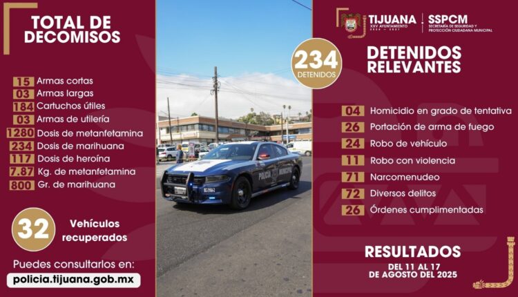 Tijuana, Baja California a 18 de agosto de 2025. La Secretaría de Seguridad y Protección Ciudadana Municipal (SSPCM) informa que, durante la semana del 11 al 17 de agosto, se logró la detención de 234 personas presuntamente implicadas en diversos delitos, como parte de las acciones intensificadas para garantizar la seguridad y la paz en la ciudad.