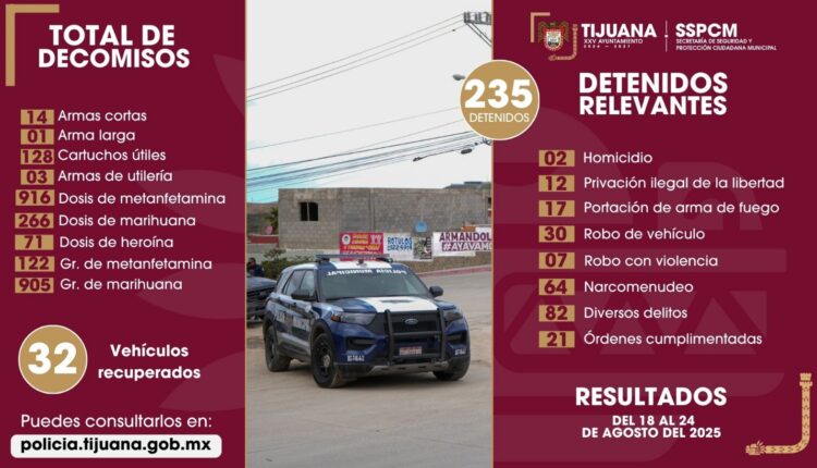 Tijuana, Baja California, a 25 de agosto de 2025.- La Secretaría de Seguridad y Protección Ciudadana Municipal (SSPCM), informa que, a través de una serie de acciones preventivas y operativos de reacción inmediata, se logró el aseguramiento de 235 personas presuntamente implicadas en diversos delitos durante el periodo comprendido entre el 18 y el 24 de agosto. Además, se aseguraron 15 armas de fuego.