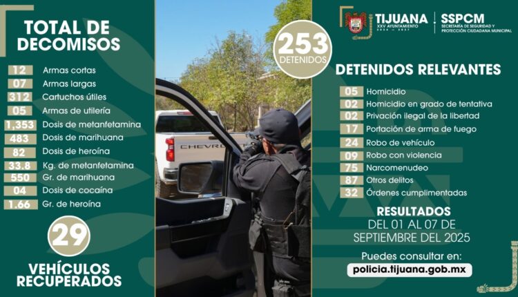 Tijuana, Baja California a 8 de septiembre de 2025.- En un esfuerzo continuo por salvaguardar la seguridad y bienestar de la población, la Secretaría de Seguridad y Protección Ciudadana Municipal (SSPCM), ha reportado logros significativos en materia de prevención del delito durante la semana del 1 y el 7 de septiembre. En este periodo, fueron detenidas 253 personas señaladas como presuntas responsables de diversos delitos, así como el decomiso de 19 armas de fuego y múltiples sustancias prohibidas.
