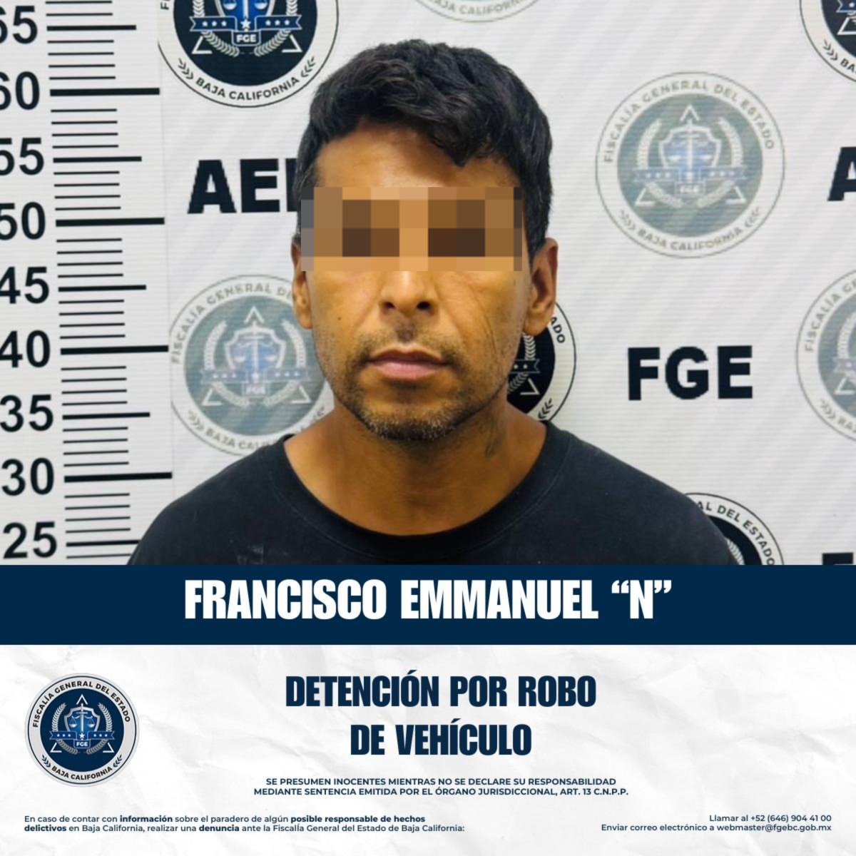 TIJUANA, BAJA CALIFORNIA A 17 DE OCTUBRE DE 2025.- A través de la colaboración interinstitucional entre la Fiscalía General del Estado y diversas entidades federativas, se logró la captura de un individuo requerido en Baja California por el delito de robo equiparado de vehículo de motor en su variante de poseer vehículo de motor robado. El operativo se desarrolló el 08 de octubre de 2025 en el Estado de Colima, donde el masculino identificado como Francisco Emmanuel “N”, quien estaba siendo buscado por un juez del Poder Judicial en Baja California, fue detenido de manera inmediata.