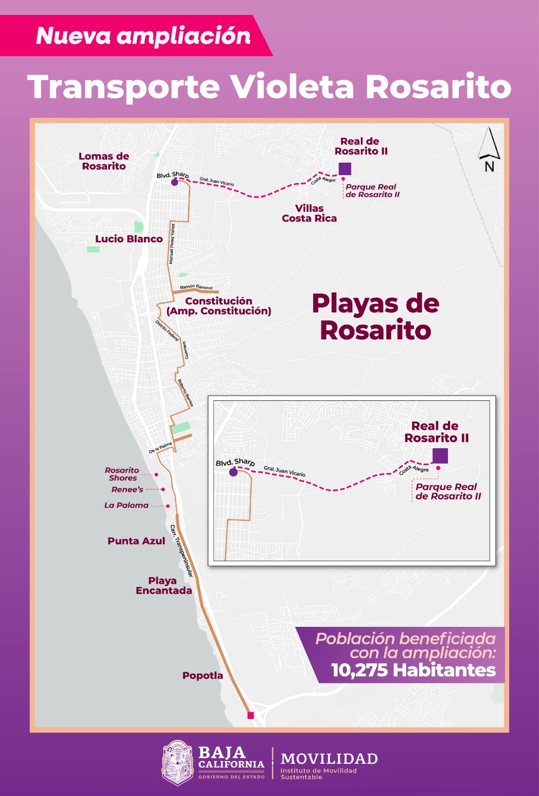 *PLAYAS DE ROSARITO, B.C., 16 DE OCTUBRE DE 2025.–* El Instituto de Movilidad Sustentable del Estado (IMOS) recordó a las usuarias del Transporte Violeta en Playas de Rosarito que, desde el pasado 13 de octubre, la ruta amplió su cobertura hasta la colonia Real de Rosarito.