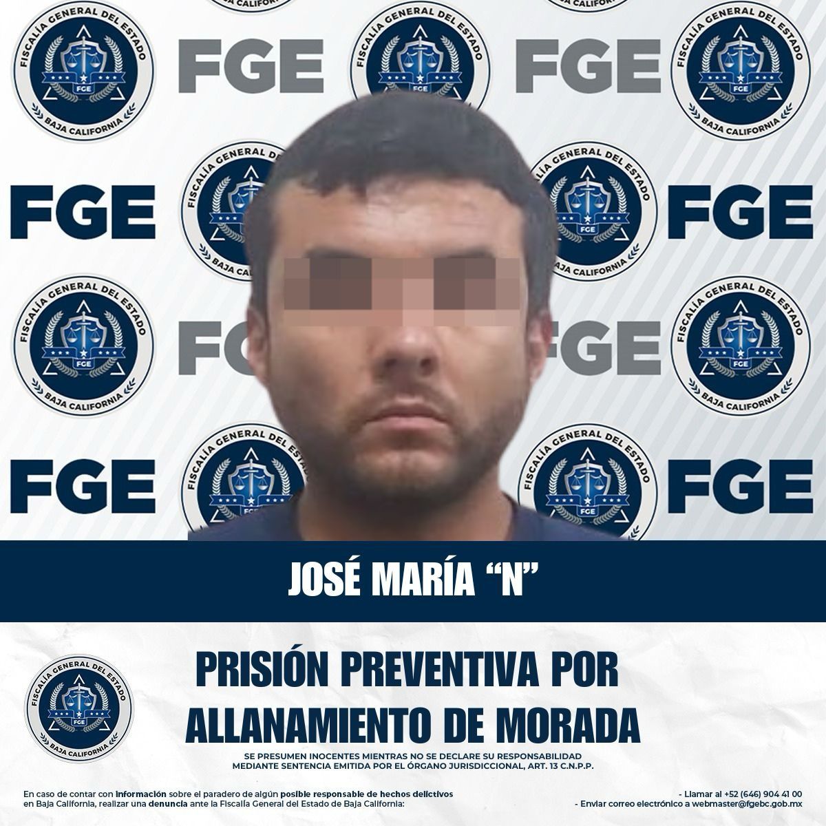 TIJUANA, BAJA CALIFORNIA, A 28 DE OCTUBRE DE 2025.- La Fiscalía Regional de Tijuana, a través de la Unidad de Investigación con Detenido, obtuvo la vinculación a proceso y la medida cautelar de prisión preventiva justificada en contra de José María “N”, por el delito de allanamiento de morada.