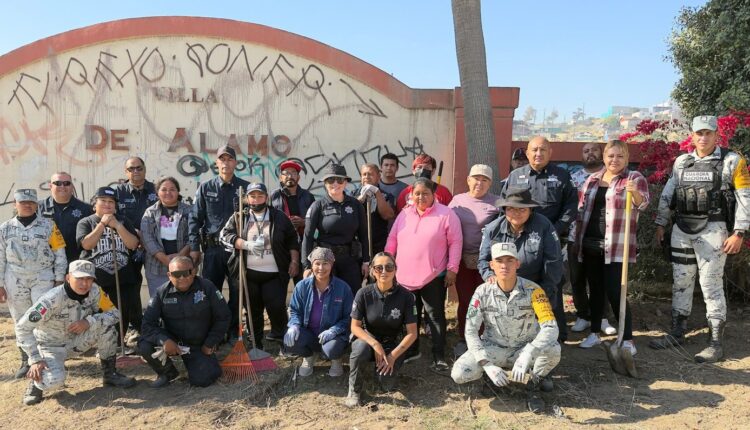 Tijuana, Baja California, a 29 de octubre de 2025.- Con el objetivo de fortalecer la proximidad con la comunidad y promover el sentido de pertenencia entre los residentes, la Secretaría de Seguridad y Protección Ciudadana Municipal (SSPCM), en coordinación con la Guardia Nacional, el Comité de Seguridad “El Mango” y vecinos del fraccionamiento Villas del Álamo, llevaron a cabo una jornada de limpieza en la entrada principal del fraccionamiento.