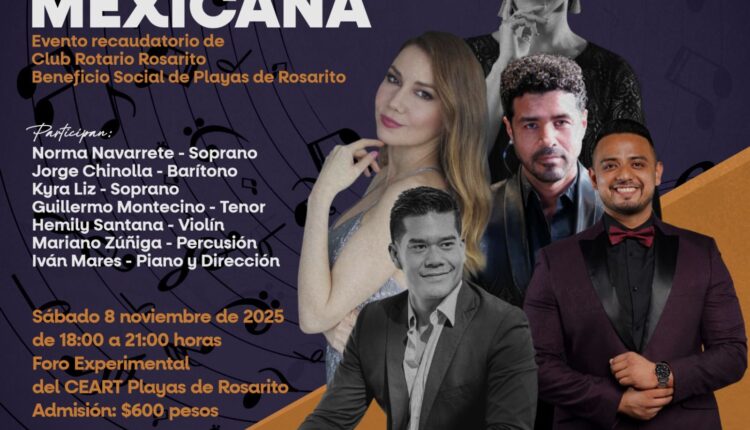 PLAYAS DE ROSARITO.– El Centro Estatal de las Artes (CEART) Playas de Rosarito abrirá sus puertas a una noche de gala con la quinta edición de Ópera a la Mexicana, un evento organizado en colaboración con el Club Rotario Rosarito con el propósito de recaudar fondos para programas de beneficio social en la comunidad, como becas para cursos y talleres artísticos, así como apoyo a programas de atención múltiple, entre otros.