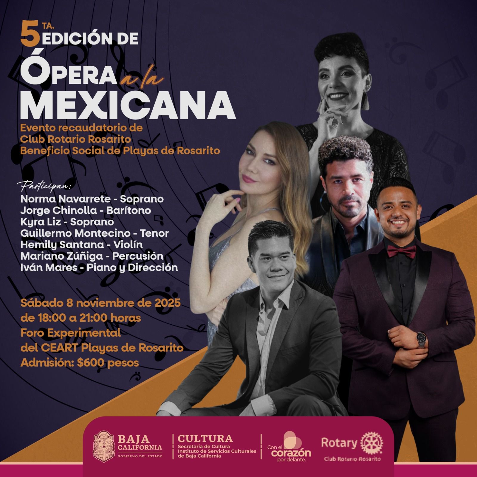 La admisión general tendrá un costo de 600 pesos, y los fondos recaudados se destinarán a las iniciativas comunitarias que el Club Rotario Rosarito promueve para mejorar la calidad de vida en el municipio. Para más información y adquisición de boletos, se invita a la ciudadanía a visitar la página oficial del evento en: https://sites.google.com/view/operaalamexicana/home