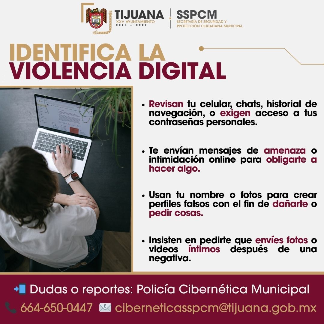 Tijuana, Baja California, a 14 de noviembre de 2025.- La Secretaría de Seguridad y Protección Ciudadana Municipal (SSPCM), a través de la Policía Cibernética de Tijuana, hace un llamado a la comunidad para prevenir, identificar y denunciar actos de violencia digital, un delito que también es real y puede comenzar con un solo clic.