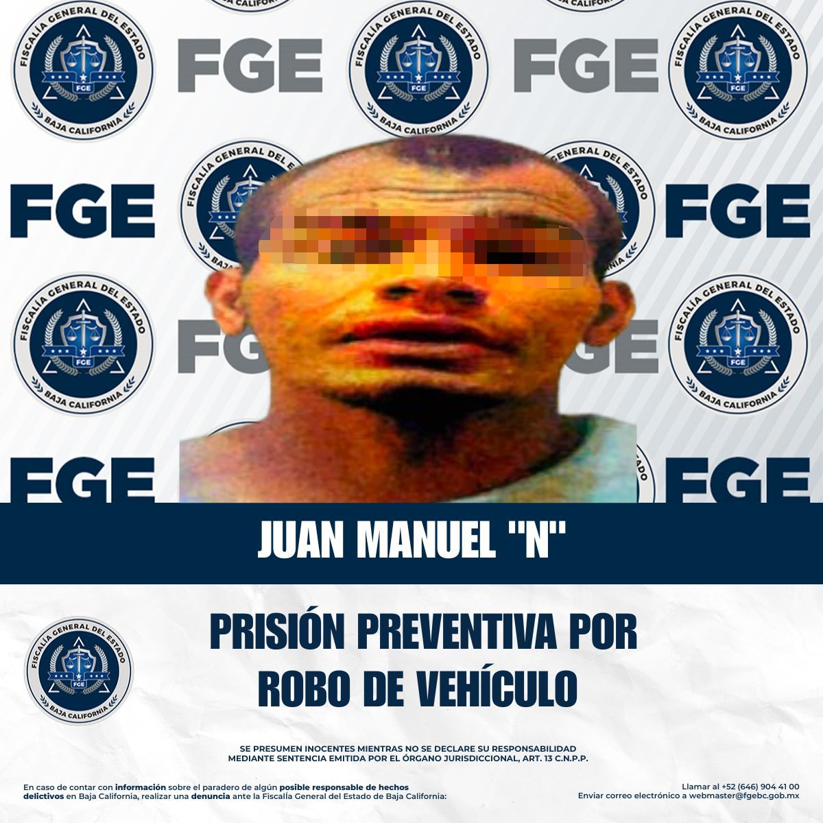 TIJUANA, BAJA CALIFORNIA – La Fiscalía Regional de Tijuana, a través de la Unidad de Investigación de Robo de Vehículos, obtuvo la vinculación a proceso en contra de Juan Manuel “N” por el delito de robo equiparado de vehículo de motor, en la modalidad de poseer vehículo robado.