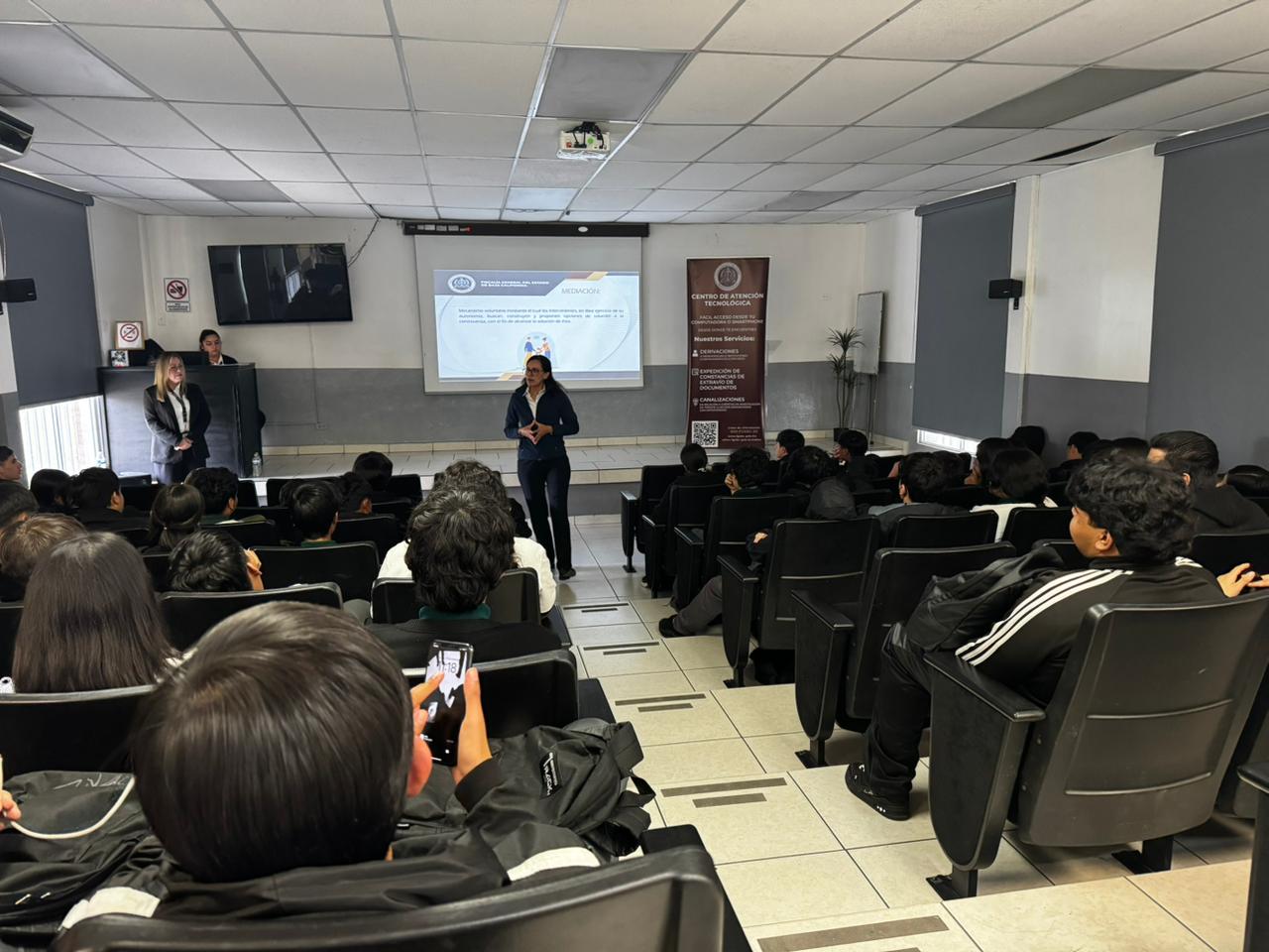 TIJUANA, BAJA CALIFORNIA – La Fiscalía General del Estado (FGE), siguiendo las instrucciones de la Fiscal General, Dra. Ma. Elena Andrade Ramírez, llevó a cabo la jornada “Conociendo a la Fiscalía General del Estado” en las instalaciones del CONALEP Tijuana I. La actividad, enmarcada en el programa “Mesa Espejo”, busca fomentar la convivencia pacífica y la construcción de entornos seguros.