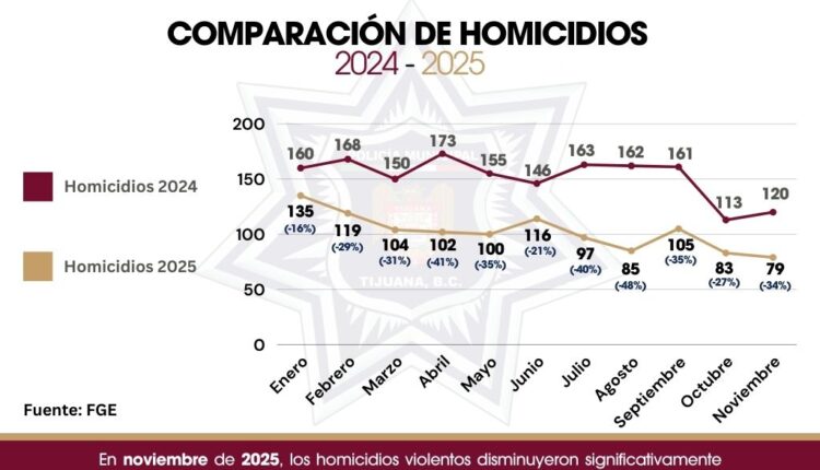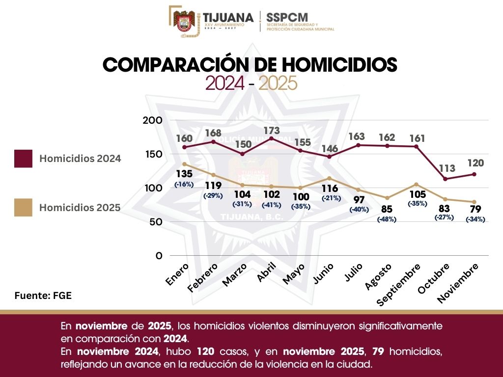 TIJUANA, B.C. – La Secretaría de Seguridad y Protección Ciudadana Municipal (SSPCM) informó que el esfuerzo coordinado de los tres órdenes de gobierno en Tijuana logró una disminución del 34% en el número de muertes dolosas en noviembre de 2025 respecto al mismo mes de 2024. Los homicidios violentos pasaron de 120 en 2024 a 79 en 2025.