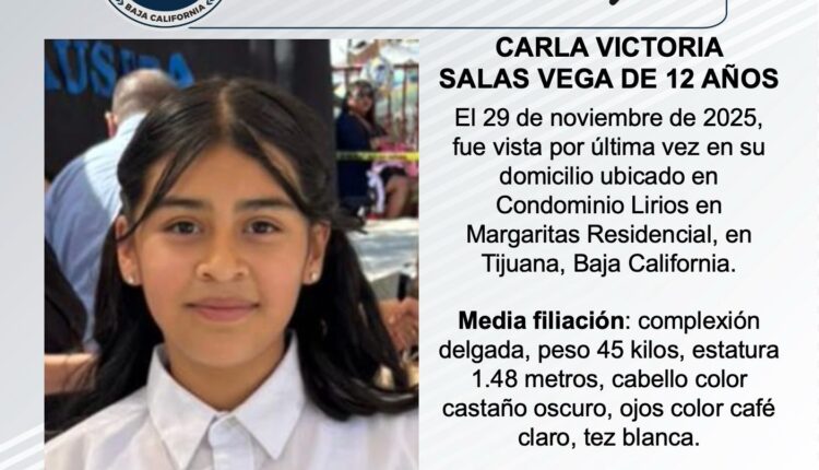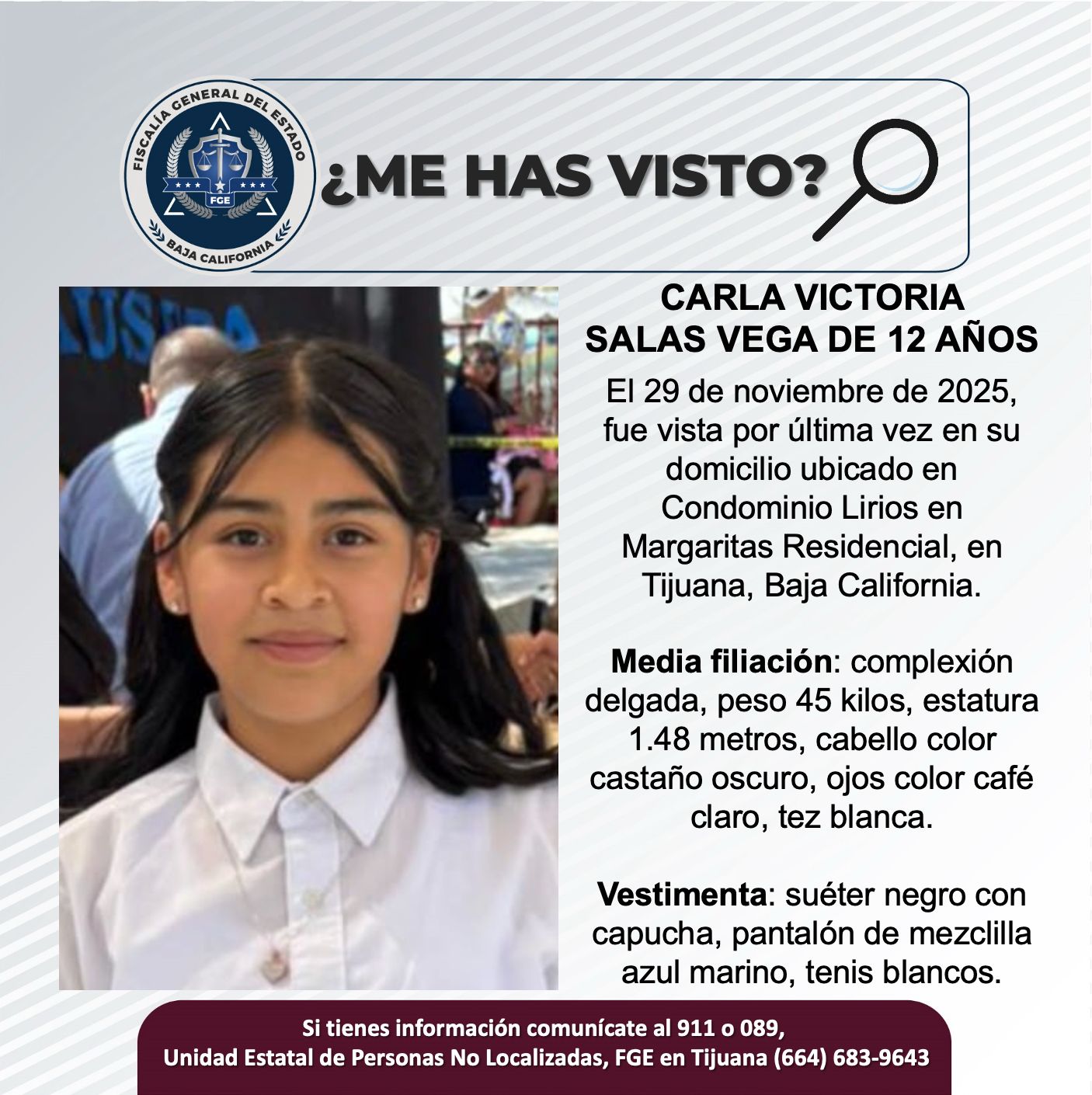 Tijuana, Baja California, a 3 de diciembre de 2025.- La Fiscalía General del Estado (FGE), solicita el apoyo de la ciudadanía para localizar a Carla Victoria Salas Vega de 12 años de edad.