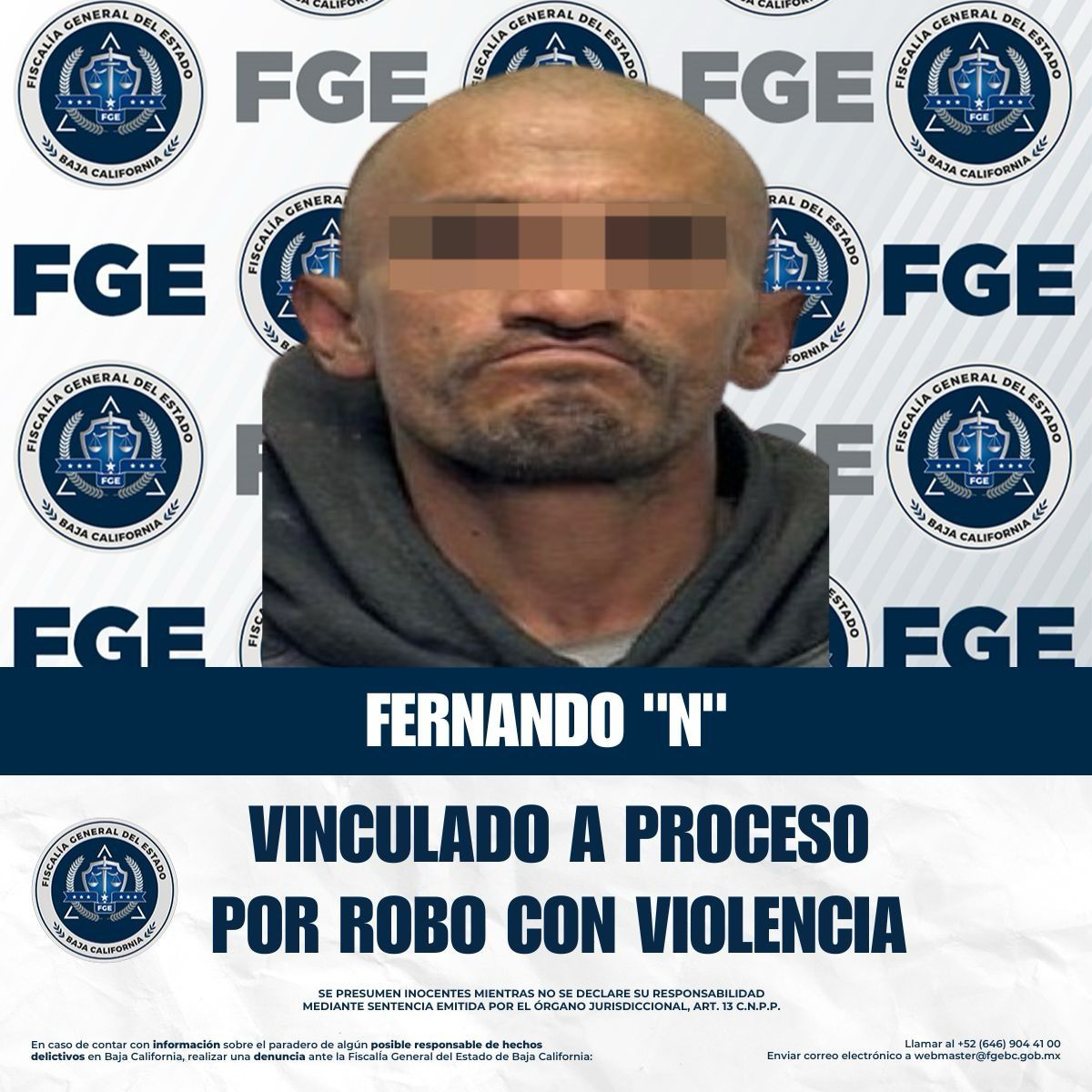 Tijuana, Baja California, a 4 de diciembre de  2025.- La Unidad de Investigación con Detenidos, adscrita a la Fiscalía Regional de Tijuana, obtuvo la vinculación a proceso y la medida de prisión preventiva justificada en contra de Fernando “N” por el delito de robo con violencia.