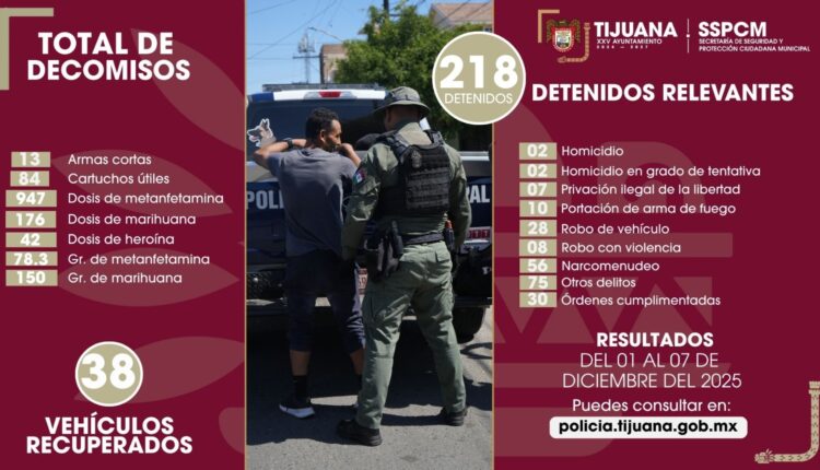 *Tijuana, Baja California a 8 de diciembre de 2025.* La Secretaría de Seguridad y Protección Ciudadana Municipal (SSPCM) informa que, como parte del fortalecimiento del operativo preventivo, elementos de la Policía Municipal realizaron la detención de 218 personas durante la semana del 1 al 7 de diciembre, derivado de los patrullajes y acciones estratégicas desplegadas en zonas prioritarias de la ciudad.