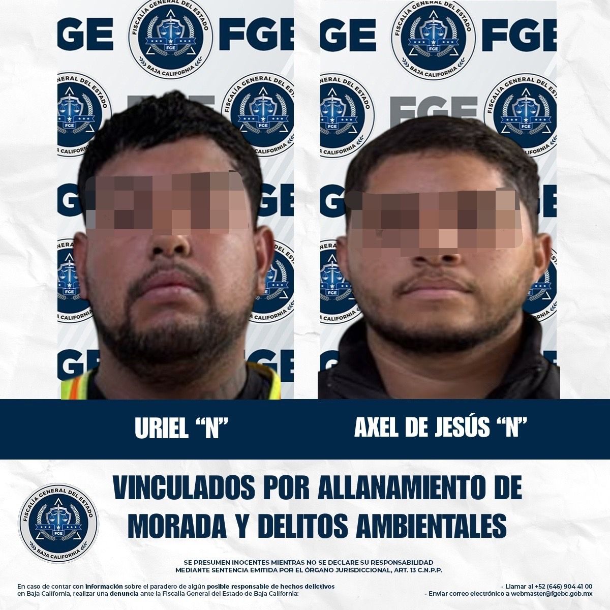 Tijuana, Baja California, a 8 de diciembre de 2025.- La Fiscalía General del Estado, bajo el liderazgo de su titular, la Dra. Ma. Elena Andrade Ramírez, reafirma su compromiso de llevar ante la ley a toda persona que cometa un delito. En seguimiento a estas directrices, la Fiscalía Regional Tijuana y la Fiscalía Especializada en Delitos Ambientales y Contra los Animales lograron obtener la vinculación a proceso de Axel de Jesús “N” y Uriel “N” por los delitos de allanamiento de morada, daño en propiedad ajena y delito ambiental por el depósito de residuos sin autorización.