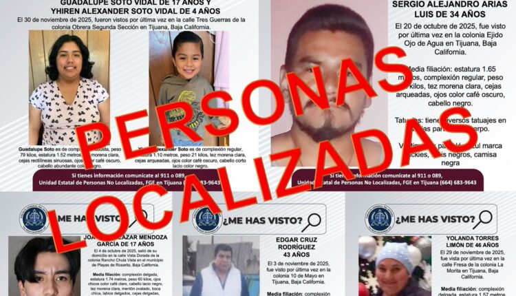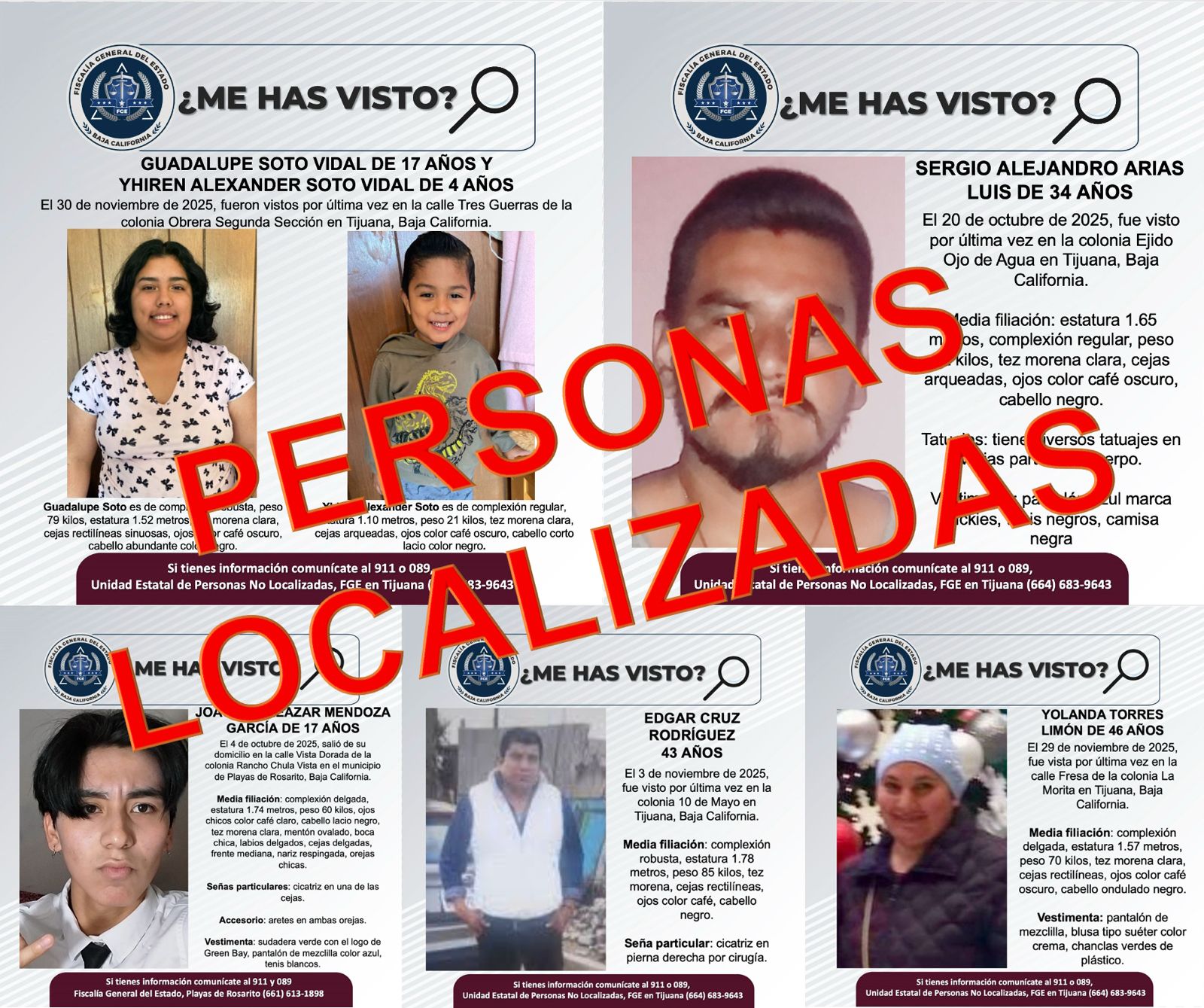 Tijuana, Baja California, a 17 de diciembre de 2025.- Agentes estatales de investigación localizaron a seis personas que habían sido reportadas como desaparecidas tanto en Tijuana como en Playas de Rosarito.
