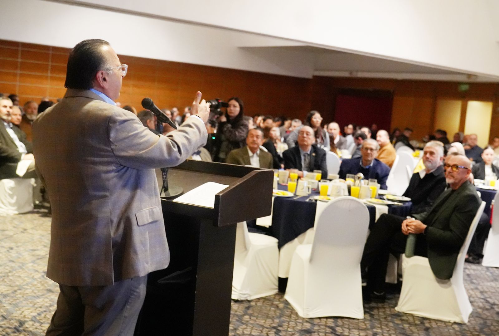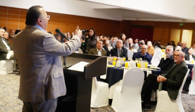 Tijuana, Baja California, 19 de diciembre de 2025. El presidente de la Cámara Nacional de Comercio (Canaco) Tijuana, Olivaldo Paz Gómez, aceptó el reto de continuar como presidente del organismo rumbo al Centenario, ante un escenario de casi 300 empresarios.