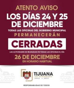 Tijuana, Baja California, a 23 de diciembre de 2025. El gobierno del presidente municipal, Ismael Burgueño Ruiz, informa que los próximos días miércoles 24 y jueves 25 de diciembre, serán días inhábiles para el personal que labora en el XXV Ayuntamiento de Tijuana, por lo que todas las oficinas en Palacio Municipal, delegaciones y dependencias paramunicipales, permanecerán cerradas a la atención al público.