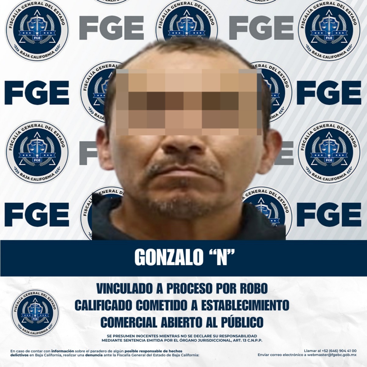 TIJUANA, B.C. – La Fiscalía Regional de Tijuana, mediante la Unidad de Investigación con Detenido, logró que un Juez de Control dictara auto de vinculación a proceso y prisión preventiva justificada contra Gonzalo “N”, presunto responsable de robo calificado a un comercio.