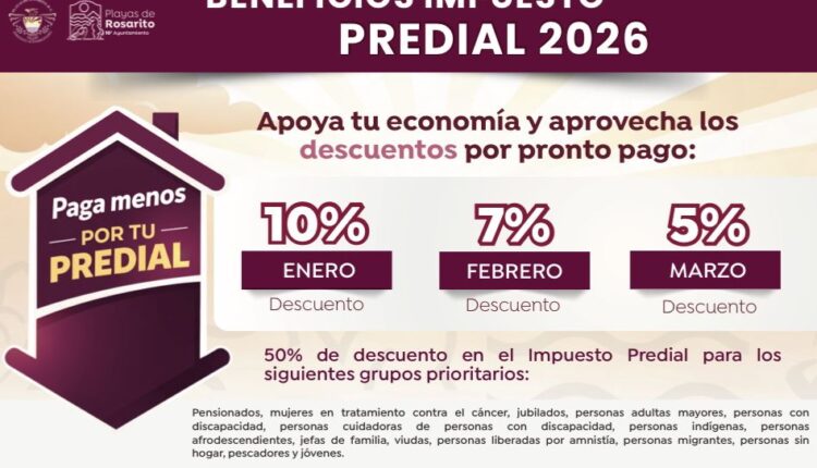 Playas de Rosarito, B.C. a 31 de diciembre de 2025.El 10º Ayuntamiento de Playas de Rosarito, encabezado por la Presidenta Municipal Rocío Adame, informa a la ciudadanía sobre los beneficios y descuentos disponibles para el pago del Impuesto Predial 2026, como parte de las acciones para apoyar la economía de las familias rosaritenses y fomentar el cumplimiento oportuno de esta contribución.