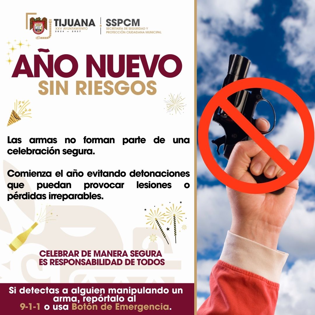TIJUANA, B.C. – Con el fin de prevenir tragedias y garantizar la seguridad de las familias tijuanenses, la Secretaría de Seguridad y Protección Ciudadana Municipal (SSPCM) reitera la prohibición absoluta de realizar detonaciones de armas de fuego durante las celebraciones de fin de año.