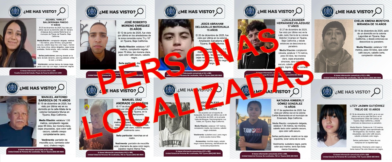 TIJUANA, BC. — La Fiscalía General del Estado (FGE) informó la localización de 10 personas que contaban con reportes de desaparición en diversos puntos de esta ciudad fronteriza. Los operativos de búsqueda fueron ejecutados por Agentes Estatales de Investigación, adscritos a la Fiscalía Especializada para la Investigación y Persecución de los Delitos de Desaparición Forzada de Personas y Desaparición Cometida por Particulares.