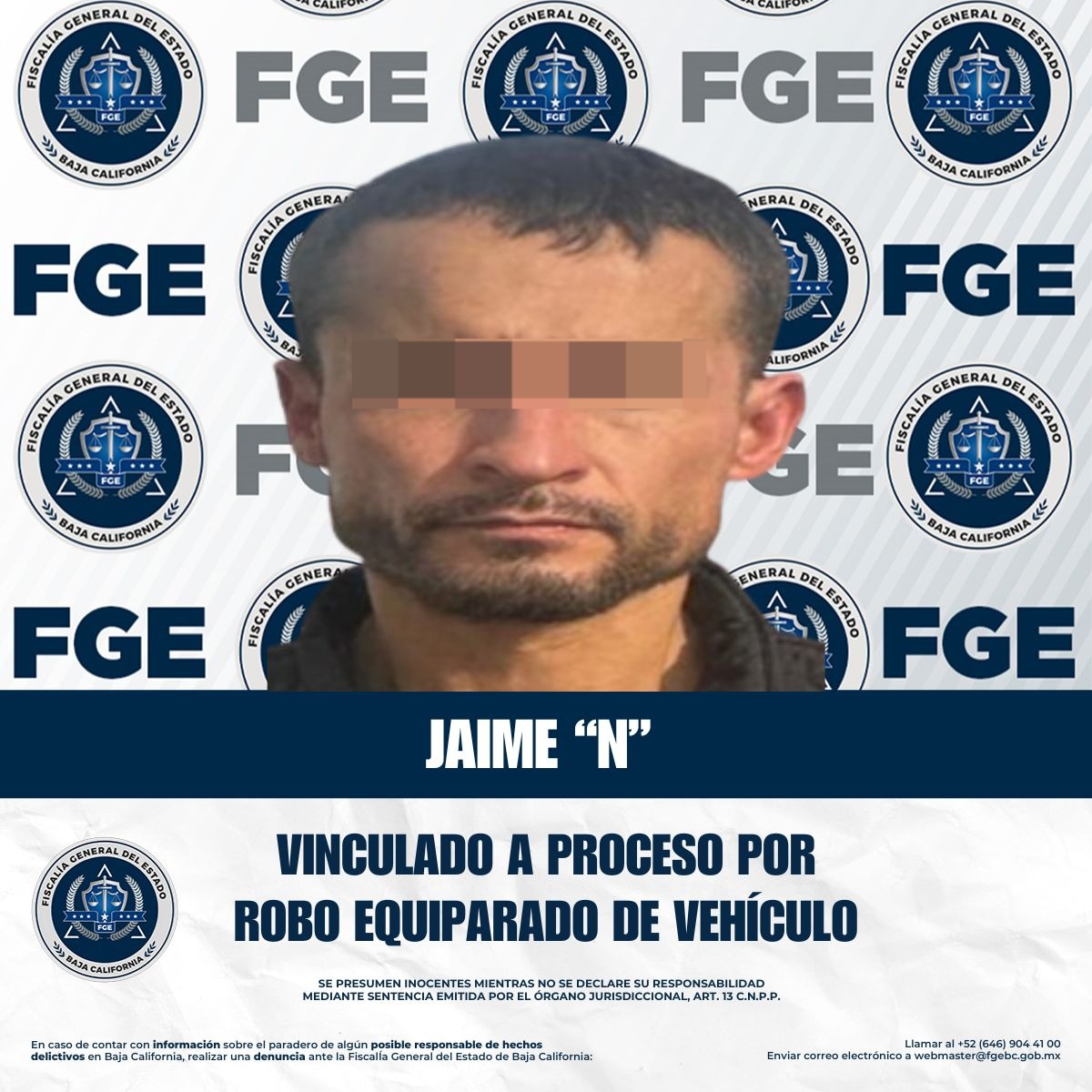 Tijuana, Baja California, a 5 de enero de 2026.- La Fiscalía Regional de Tijuana, a través de la Unidad de Investigación de Robo de Vehículos, obtuvo la vinculación a proceso y la imposición de la medida cautelar de prisión preventiva justificada en contra de Jaime “N”, por su presunta responsabilidad en el delito de robo equiparado de vehículo de motor, en su modalidad de uso.
