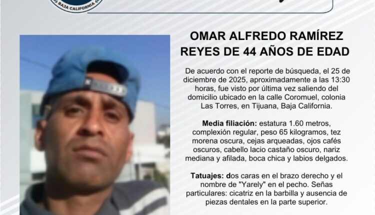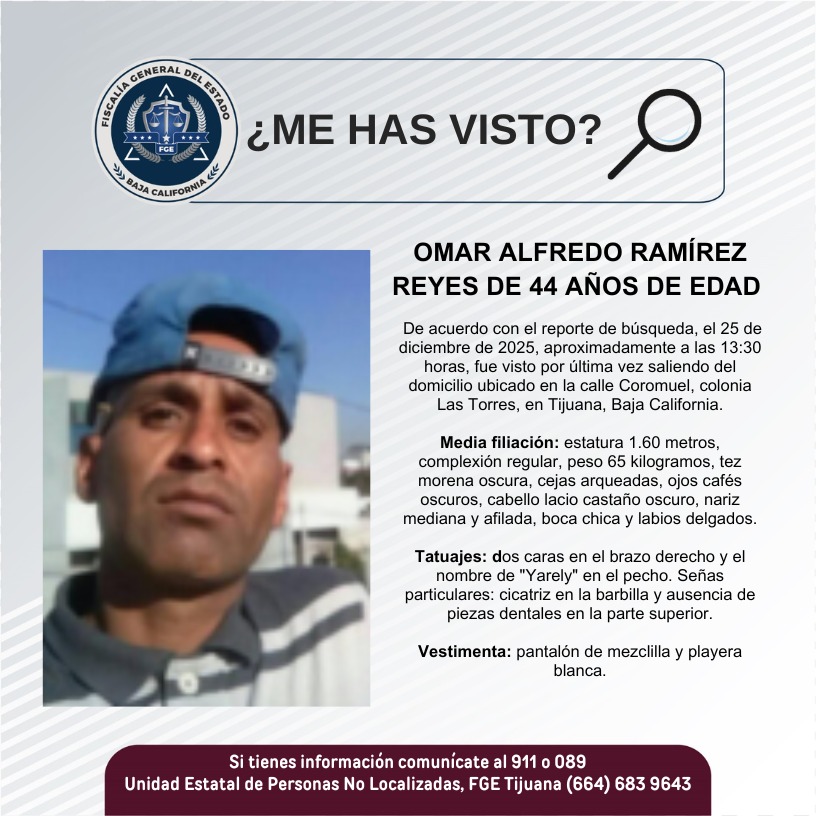 Tijuana.-La Fiscalía General del Estado (FGE) emitió una pesquisa para localizar a Omar Alfredo Ramírez Reyes, de 44 años de edad, quien fue visto por última vez el pasado 25 de diciembre de 2025. Según el reporte oficial, el hombre salió de su domicilio ubicado en la calle Coromuel, en la colonia Las Torres, aproximadamente a las 11:00 horas, y desde ese momento se desconoce su paradero.