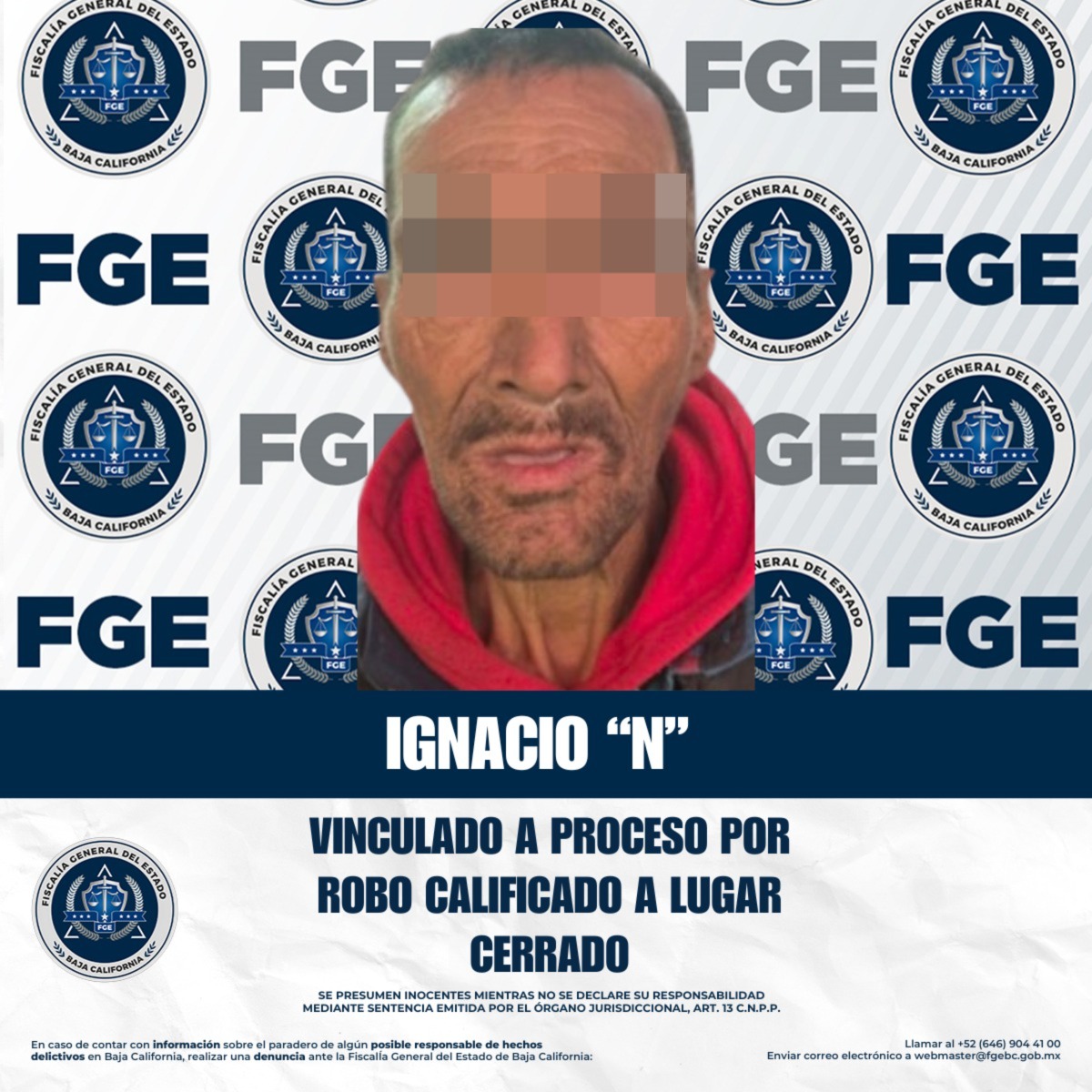 TIJUANA, BAJA CALIFORNIA, 9 DE ENERO DE 2026.– La Fiscalía Regional de Tijuana obtuvo la vinculación a proceso de Ignacio “N”, por su presunta responsabilidad en el delito de robo calificado a lugar cerrado.