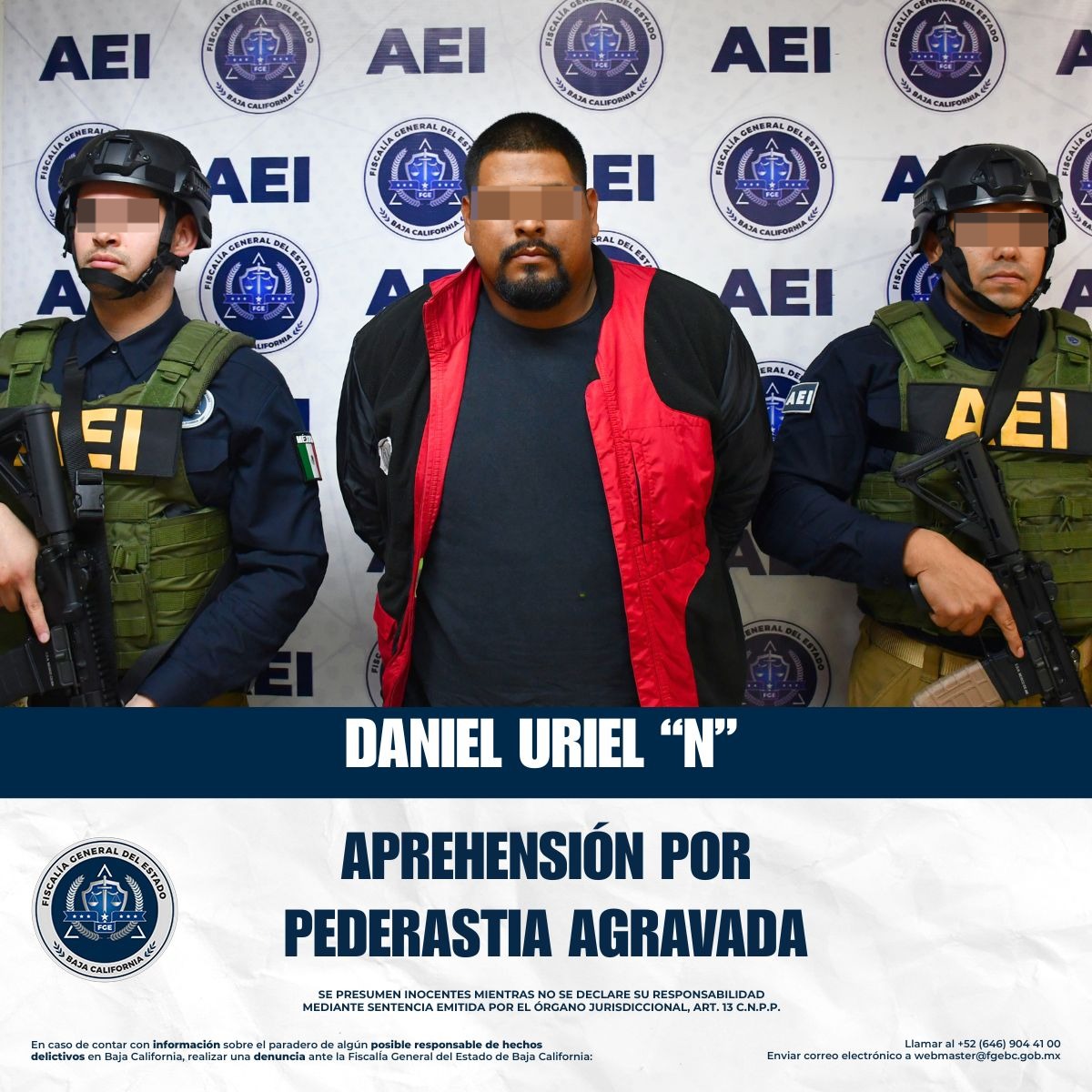 TIJUANA, BAJA CALIFORNIA, A 10 DE ENERO DE 2026.- Elementos de la Fiscalía General del Estado, en cumplimiento de la instrucción permanente de salvaguardar los derechos y la seguridad de niñas, niños y adolescentes, ejecutaron una orden de aprehensión en contra de Daniel Uriel “N”, por su probable responsabilidad en el delito de pederastia agravada.