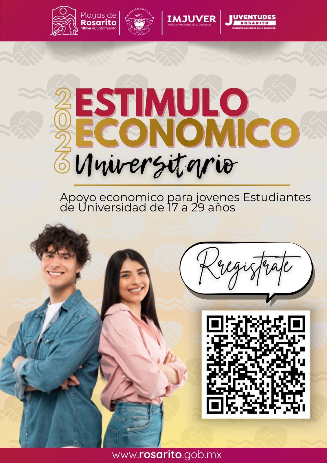 (Playas de Rosarito, B.C., 12 de enero de 2026). El 10° Ayuntamiento de Playas de Rosarito, encabezado por la presidenta municipal Rocío Adame, abrió la convocatoria para el Programa Estímulo Económico Universidad 2026. A través del IMJUVER, se otorgará un apoyo de $2,000 pesos en una sola exhibición a jóvenes de entre 17 y 29 años que cursen estudios superiores en instituciones públicas o privadas.