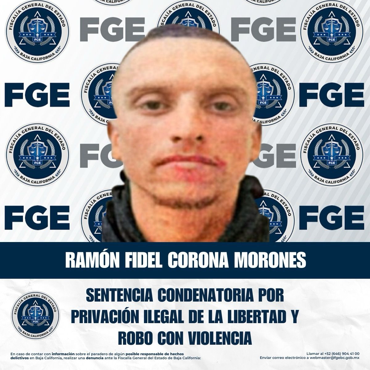 La Fiscalía Regional de Tecate obtuvo una sentencia condenatoria contra Ramón Fidel Corona Morones por delitos de alto impacto, entre ellos privación de la libertad agravada, robo con violencia y robo de vehículo ejecutado con violencia, derivados de hechos ocurridos en diciembre de 2022.