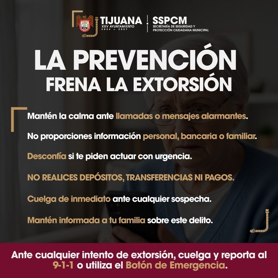 Tijuana, Baja California, 28 de enero de 2026.- La Secretaría de Seguridad y Protección Ciudadana Municipal dio a conocer una serie de medidas preventivas para evitar que la población de Tijuana sea víctima de extorsión telefónica.