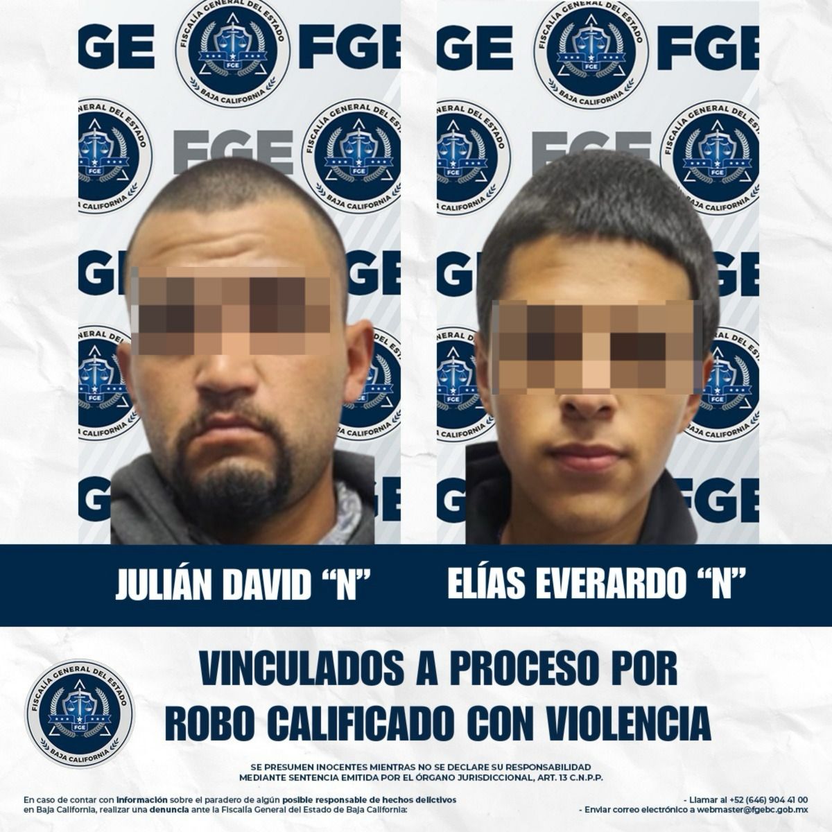 TIJUANA, BAJA CALIFORNIA, A 5 DE FEBRERO DE 2026.– La Fiscalía Regional de Tijuana, a través de la Unidad de Investigación con Detenido, obtuvo la vinculación a proceso y la imposición de prisión preventiva oficiosa en contra de Julián David “N” y Elías Everardo “N”, por su presunta responsabilidad en el delito de robo calificado cometido de noche y ejecutado con violencia.
