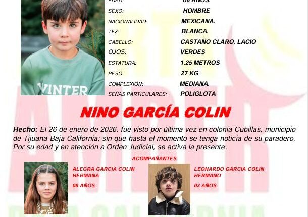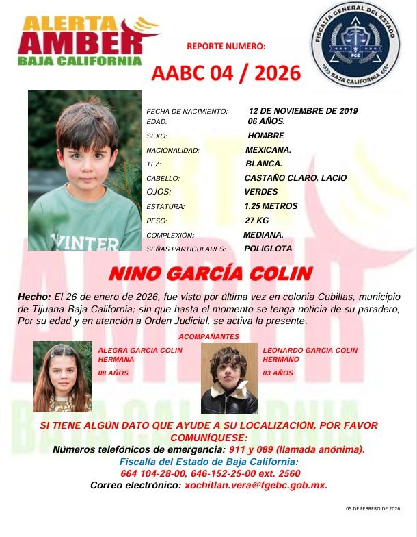 TIJUANA, B.C., A 6 DE FEBRERO DE 2026. La Fiscalía General de Baja California ha activado la Alerta Amber para localizar los menores Alegra, Nino y Leonardo García Colín de 8, 6 y 3 años de edad, respectivamente.