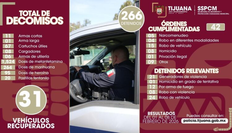 Tijuana, Baja California, 9 de febrero de 2026. La Secretaría de Seguridad y Protección Ciudadana Municipal (SSPCM) de Tijuana informó la recuperación de 31 vehículos con reporte de robo y el decomiso de casi 2,000 dosis de narcóticos en acciones preventivas realizadas durante la última semana. Estas labores forman parte del plan de ordenamiento y seguridad instruido por el alcalde Ismael Burgueño Ruiz.