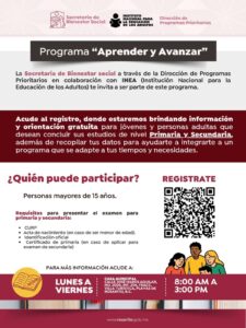 La iniciativa está dirigida a personas mayores de 15 años que no concluyeron sus estudios de Primaria o Secundaria, con el objetivo de brindarles herramientas educativas que contribuyan a su desarrollo personal y laboral, además de mejorar su calidad de vida y autonomía.