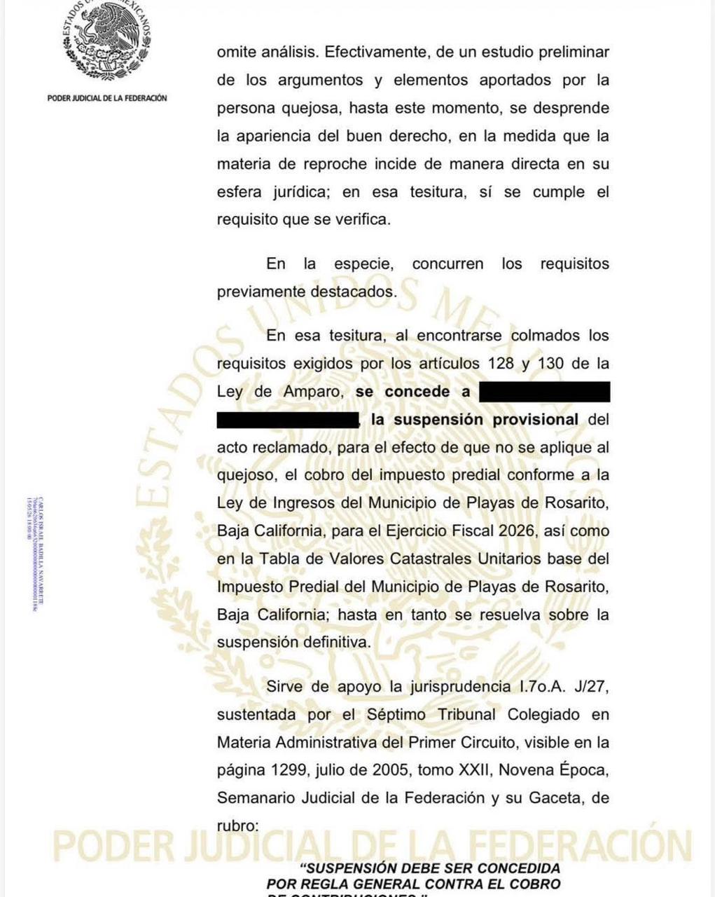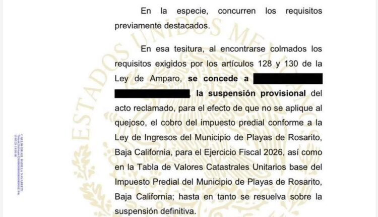 Rosarito, Baja California, 12 de febrero de 2026.— Un juez federal concedió la suspensión provisional a un ciudadano que promovió un juicio de amparo contra el incremento del impuesto predial aplicado por el Ayuntamiento de Playas de Rosarito a partir de enero de 2026.