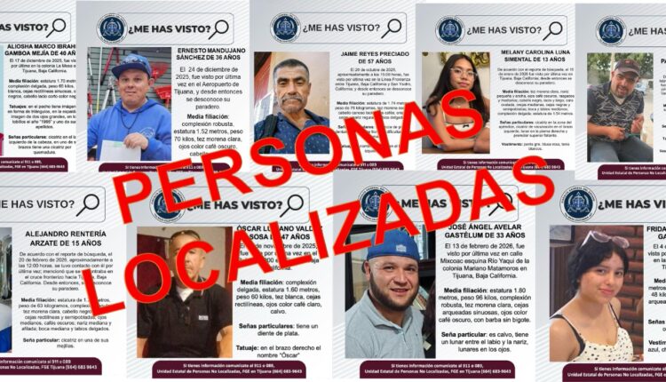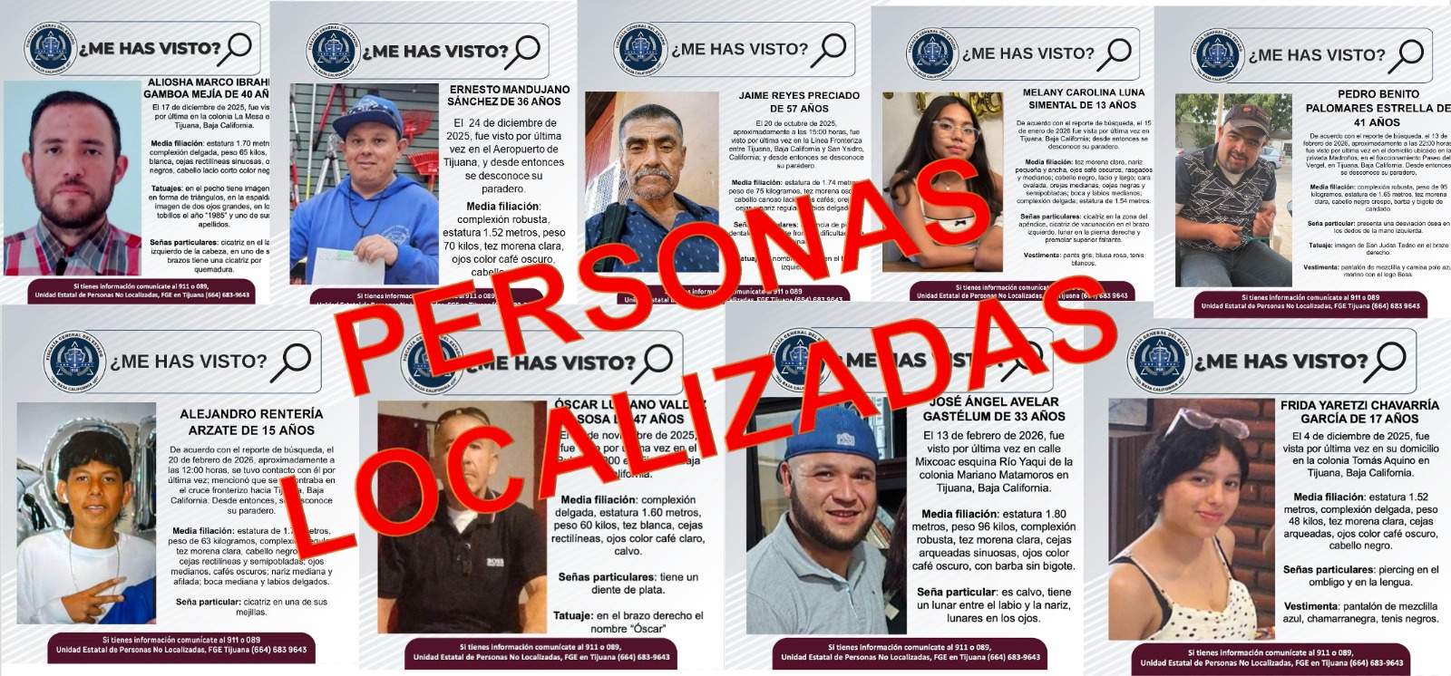 Tijuana, Baja California, 2 de marzo de 2026.- La Fiscalía Especializada en Desaparición Forzada informó que en Tijuana fueron localizadas nueve personas que contaban con reporte de desaparición, tras operativos realizados por agentes estatales de investigación.