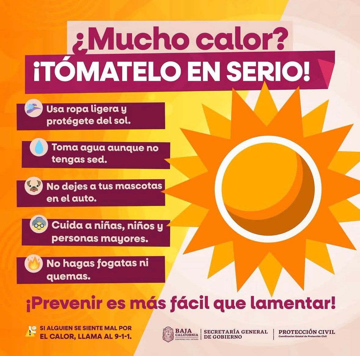 Finalmente, se recordó a los residentes y visitantes de la Zona Costa que cualquier síntoma relacionado con el calor excesivo debe ser atendido por profesionales. La autoridad cerró su mensaje preventivo con una instrucción clara: “¡La prevención hace la diferencia! Ante cualquier emergencia médica, comunícate de inmediato al 9-1-1”.
