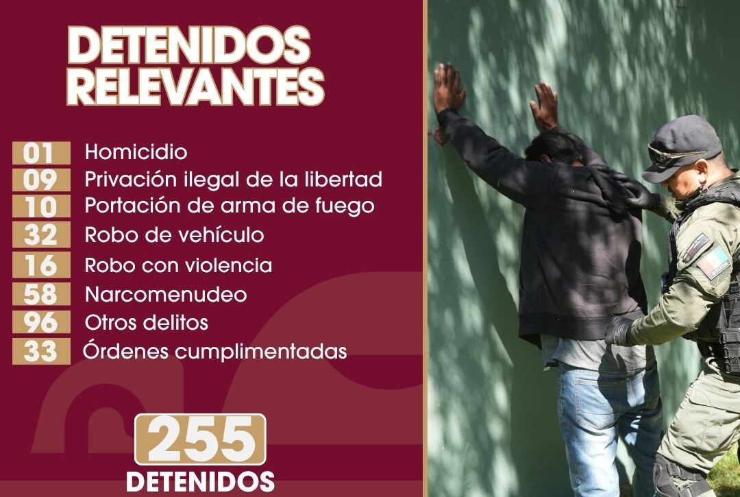 Del total de detenidos, la Policía Municipal detalló que una persona fue arrestada por su presunta relación con un homicidio, mientras que nueve más enfrentan cargos por privación de la libertad. Asimismo, diez sujetos fueron interceptados en posesión de armas de fuego y 58 personas fueron aseguradas por delitos relacionados con el narcomenudeo, una de las problemáticas con mayor presencia en las colonias de la periferia.