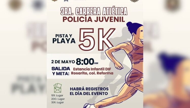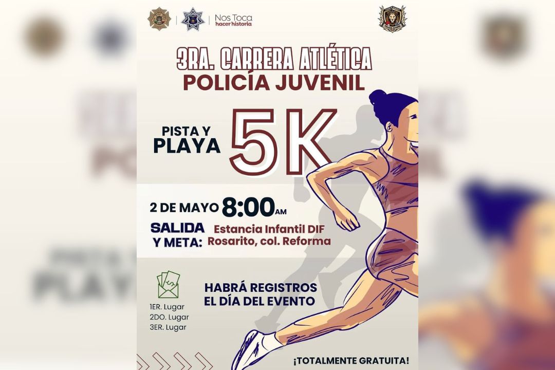 Playas de Rosarito, 19 de abril de 2026.- La agrupación de la Policía Juvenil de Playas de Rosarito lanzó la convocatoria oficial para la tercera edición de su Carrera Atlética 5K “Pista y Playa”, la cual se celebrará el sábado 2 de mayo. El evento tendrá como sede principal la colonia Reforma y busca reunir a la comunidad local en una mañana de actividad física sin costo de inscripción.