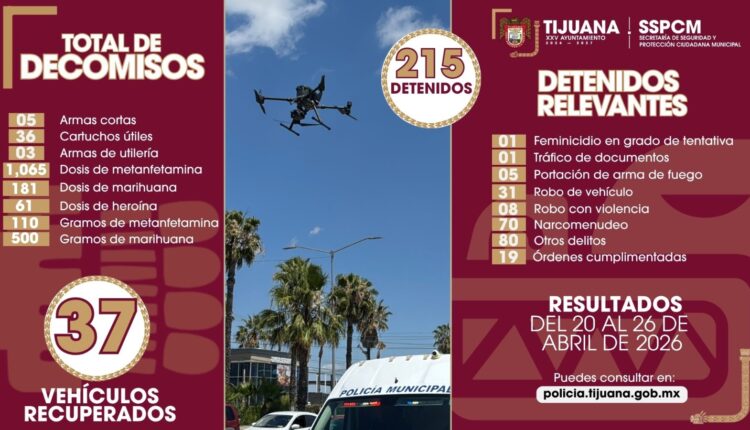 Tijuana, Baja California, 27 de abril de 2026.- Un total de 215 personas fueron detenidas por la Policía Municipal de Tijuana durante la última semana de operativos preventivos realizados en diversos puntos de la ciudad. Entre las capturas destaca el aseguramiento de sujetos implicados en delitos de alto impacto como tentativa de feminicidio, tráfico de personas y portación de armas de fuego.